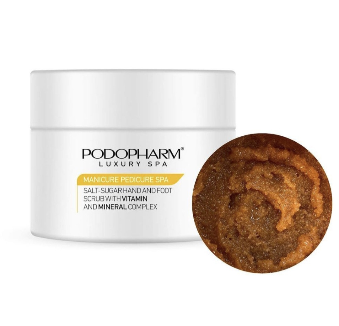 Οι κρύσταλλοι ζάχαρης και αλατιού πλούσιοι σε μακρο και μικροστοιχεία σε συνδυασμό με φυσικά κελύφη σπόρου αμυγδάλου δημιουργούν έναν εξαιρετικό συνδυασμό παρασκευάσματος απολέπισης. Το σύμπλεγμα φυτικών μαλακτικών, βούτυρο καριτέ, κερί φλούδας πορτοκαλιού και αμυγδαλέλαιο που περιέχεται στο απολεπιστικό ενυδατώνει έντονα και θρέφει το δέρμα των χεριών και των ποδιών. Η παρουσία φυσικών ελαίων μέντας και μανταρινιού εισάγει μια εξαιρετικά ευχάριστη κατάσταση χαλάρωσης κατά τη διάρκεια της θεραπείας.